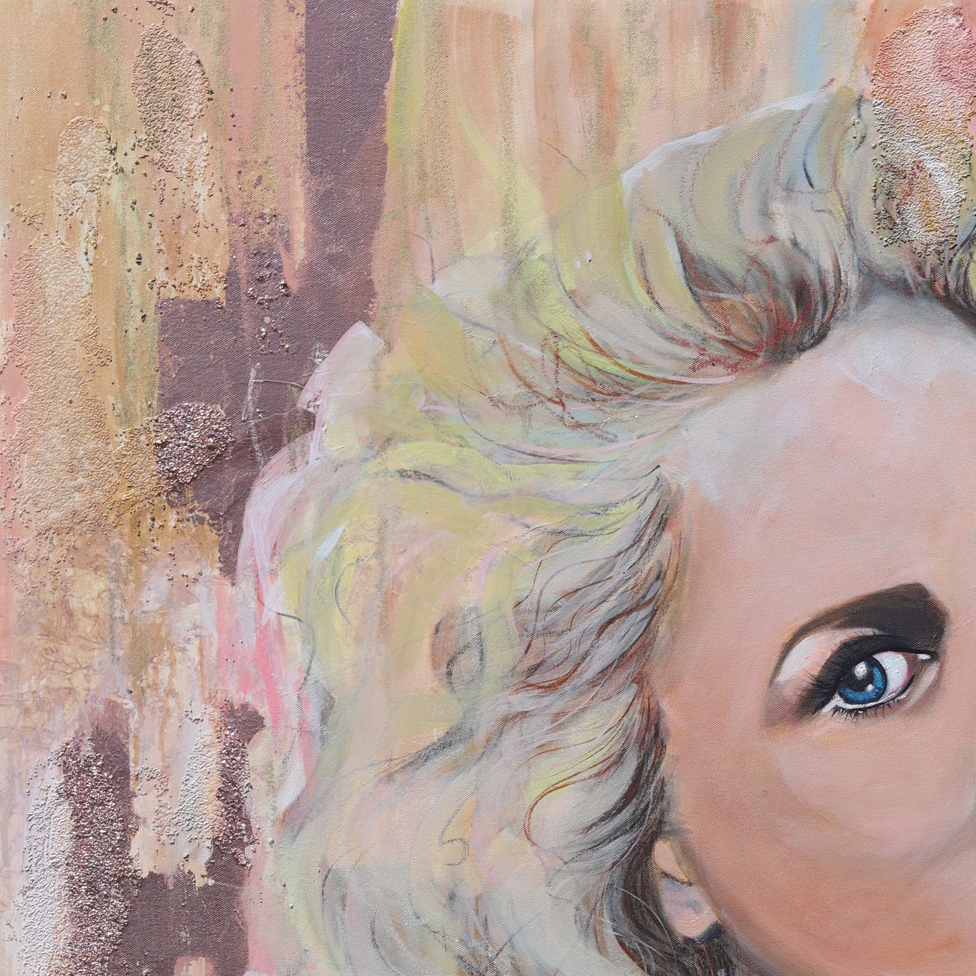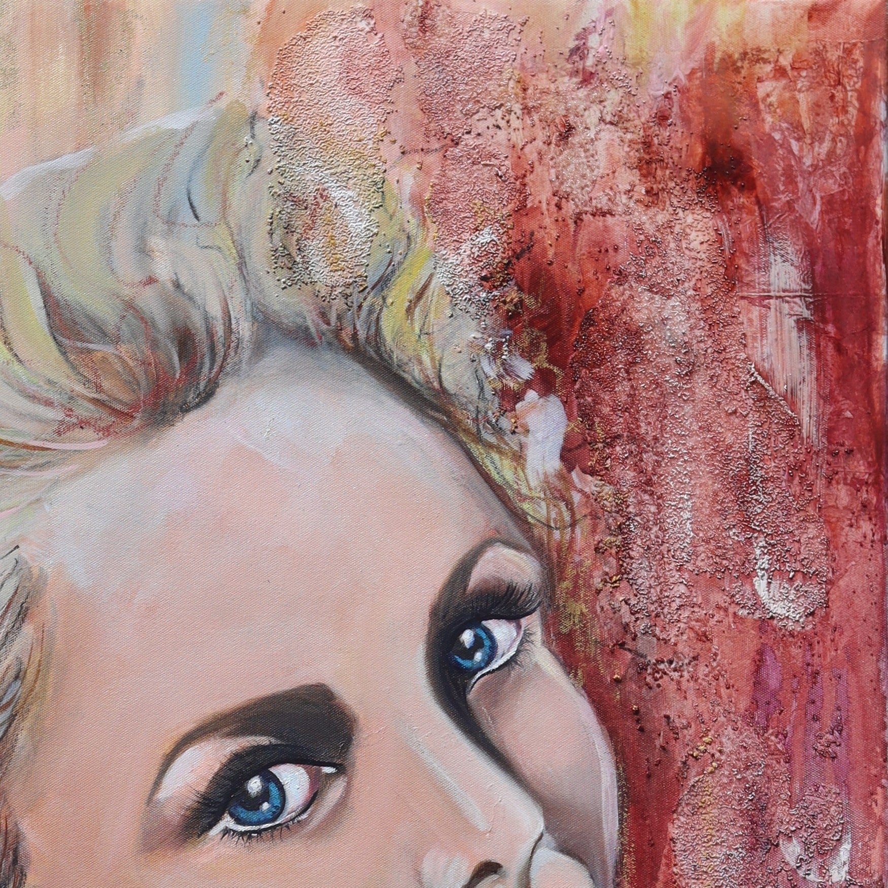 Painted in tones of rose, burnt berry, and golden blush, this portrait evokes the vintage glamour of 1950s cinema while capturing Janet's captivating presence and undeniable allure. Her piercing blue eyes draw you in — a perfect contrast to the textured, painterly backdrop that echoes the drama and intensity she so often portrayed on screen.