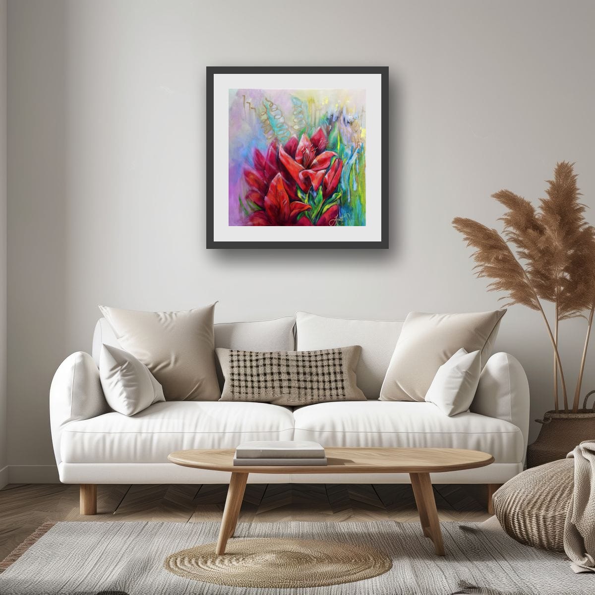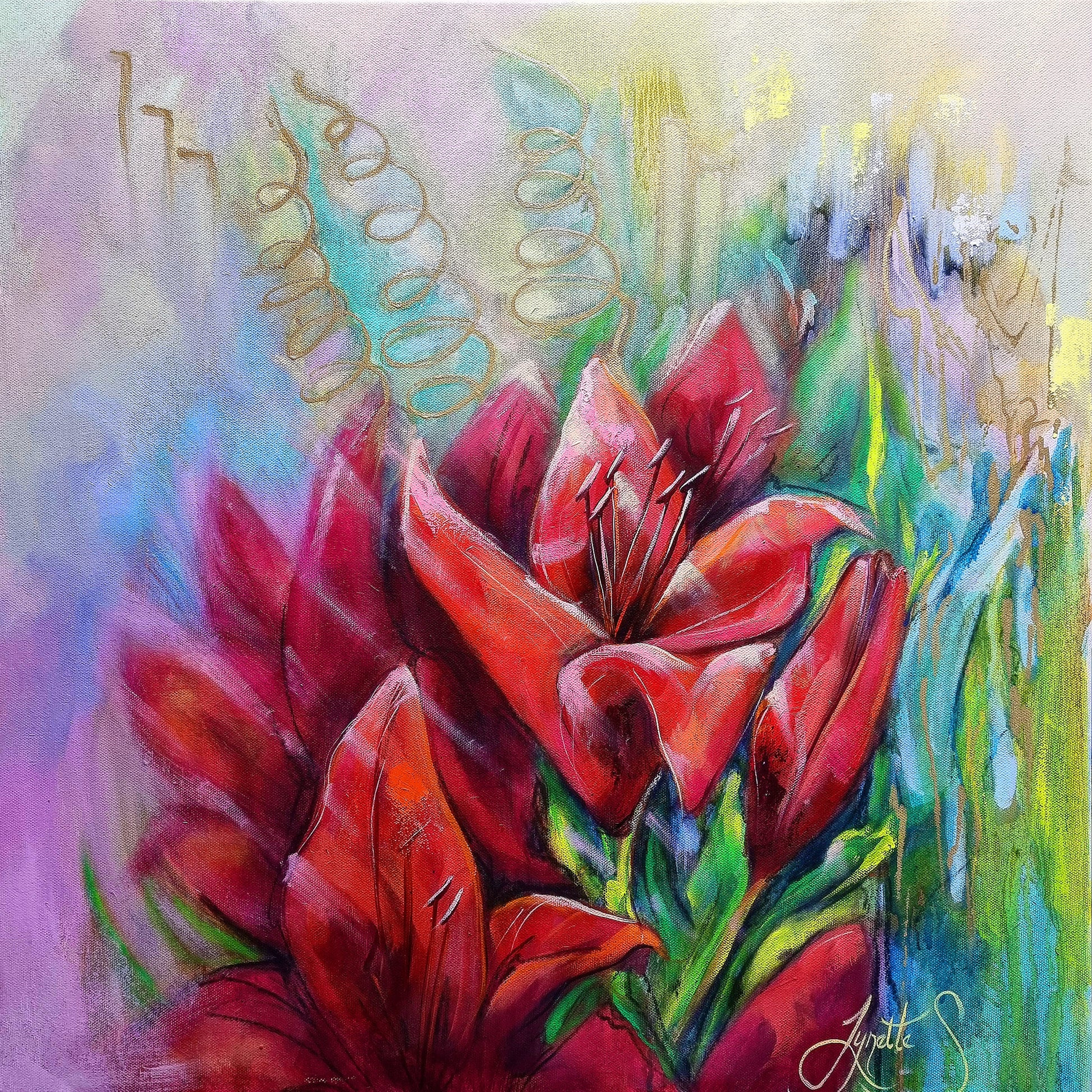 The lilies stand as a song within that softness, rich and expressive, their scarlet tones speaking of passion, devotion, and life force. Subtle splashes and swirling lines of gold rise through the work, symbolising ascension — the lifting of energy toward the divine, where beauty becomes something sacred rather than simply seen.